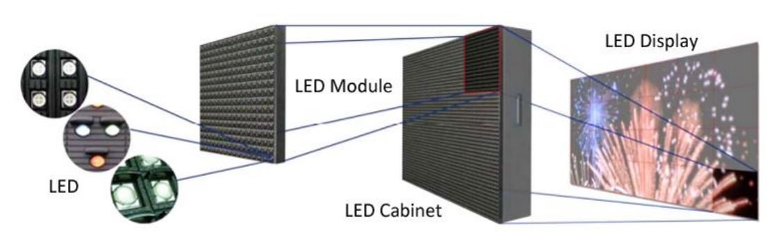 Cấu tạo của màn LED dựa trên việc kết hợp các tấm module LED lại với nhau. Bên trong màn hình có nguồn điện, quạt và một số dây dẫn kết nối. Màn hình được bảo vệ bởi một khung vững chắc bên ngoài, bảo đảm an toàn cho cả màn hình và các thiết bị bên trong.
