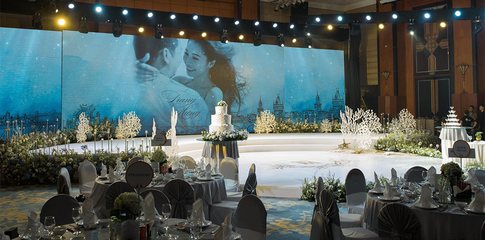 Màn hình chiếu LED cho nhà hàng tiệc cưới: với kích thước linh hoạt và hiển thị sắc nét. Điều khiển từ xa hoặc bằng phần mềm để cập nhật thông tin dễ dàng.