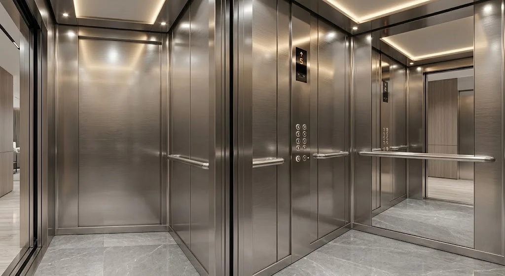 - Cabin & Cửa tầng: Vách inox, sàn đá, trần giả, nút bấm, màn hình hiển thị (chiếm 30%).