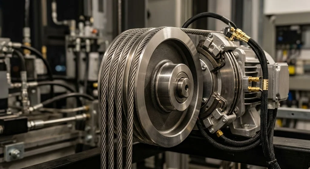 Hệ thống này hoạt động dựa trên nguyên lý đối trọng — cabin và một khối tạ được kết nối với nhau qua hệ thống cáp tải thép, vắt qua puly của động cơ kéo. Công Ty TNHH Giải Pháp Công Nghệ High Vision triển khai công nghệ động cơ không hộp số (sử dụng nam châm vĩnh cửu) cho hầu hết các công trình 5 tầng. Loại động cơ này không sử dụng dầu mỡ bôi trơn — nghĩa là gia chủ yên tâm về vấn đề bảo vệ môi trường, không có mùi dầu máy trong nhà và tiết kiệm khoảng 40% lượng điện năng tiêu thụ so với các dòng máy kéo thế hệ cũ.